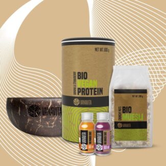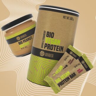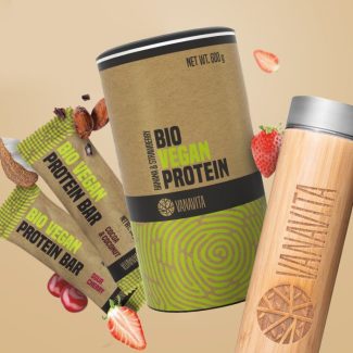 BIO Vegan Proteín pritom obsahuje až 16 g bielkovín na jednu dávku a len minimum sacharidov a tukov. Vďaka svojmu zloženiu je výborne rozpustný, ľahko stráviteľný a navyše lahodne chutný. Obsahuje totiž BIO kokosový cukor a BIO ovocné prášky, ktoré mu dodávajú jemnú sladkú chuť v dvoch príchutiach – choco&berries a banana strawberry.